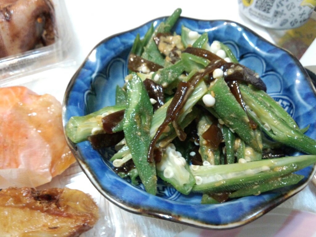 茎の佃煮とオクラをわさびで