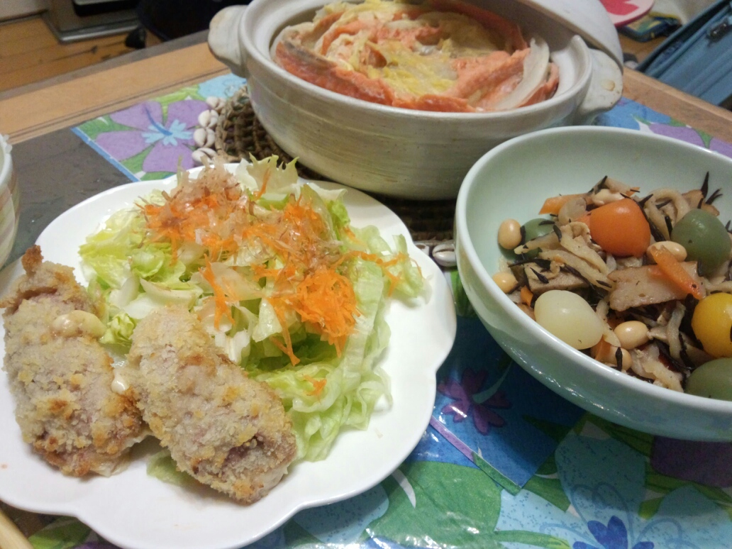 今日は白菜と鮭の骨の所の鍋